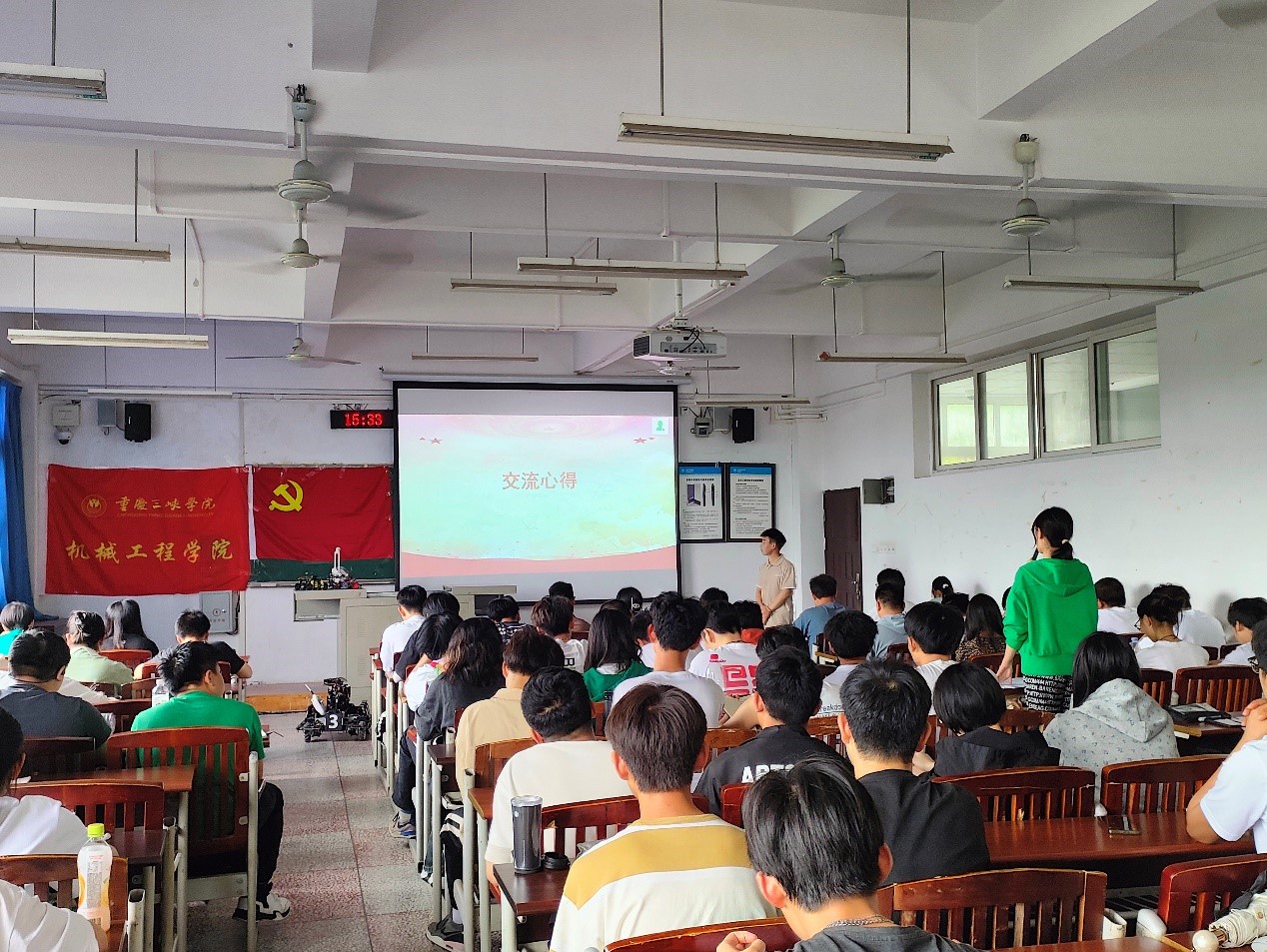 在交流讨论环节,同志们以“青年大学生如何践行新质生产力”作学习交流。张艮同志认为作为研究生要静下心来寻突破、沉淀自我做科研,青年学生一代应有敢为人先的创新精神,在创新成果上攻坚克难,积极投身战略性新兴产业和未来产业。刘成喜同志分享自身参加专业竞赛的经历和收获,展示参赛作品并热心解答同学们的疑问,呼吁广大同学要积极参与专业竞赛,在专业领域学习上,突破传统学习路径,紧跟发展导向,打造新质生产力。