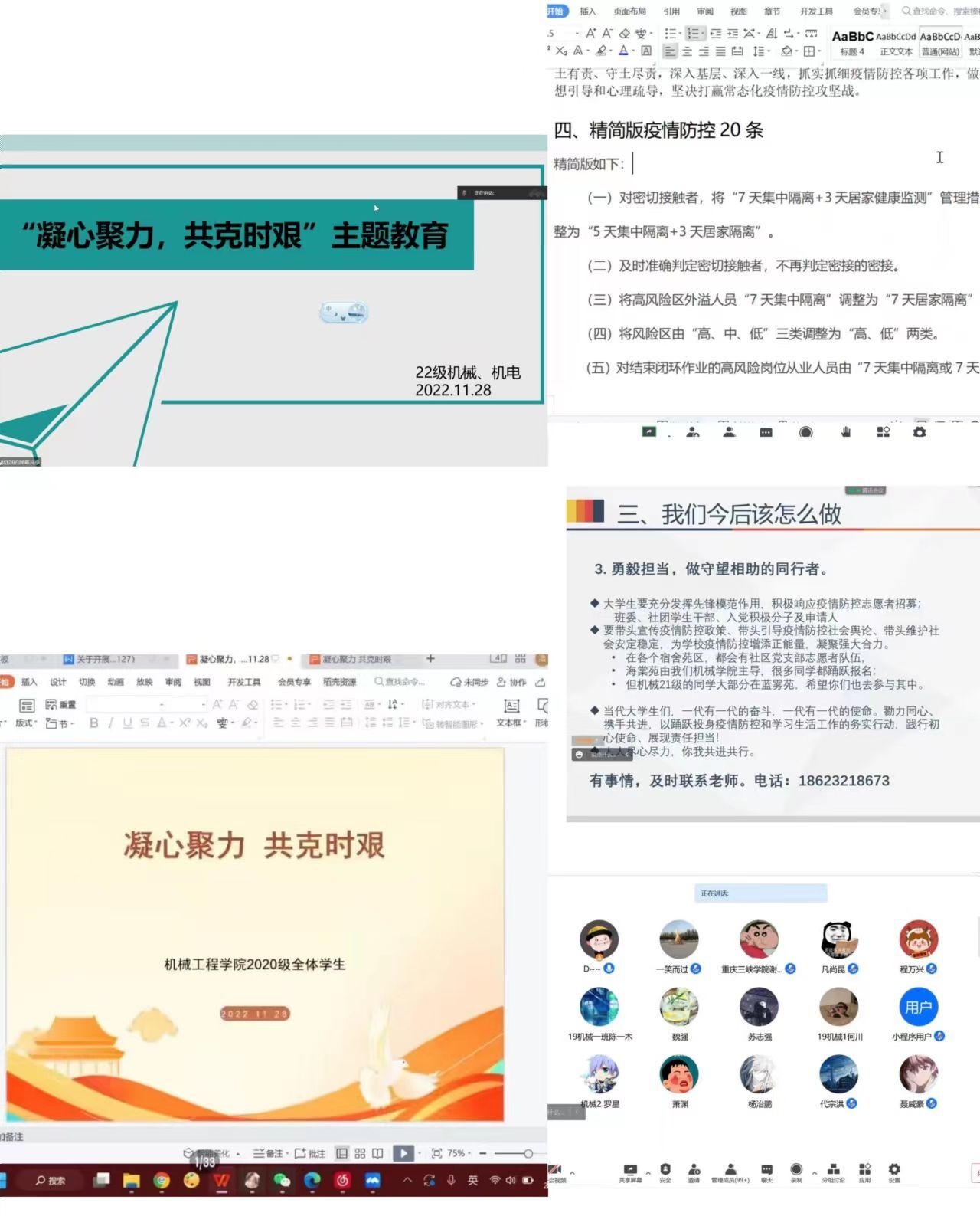 当前疫情防控形势严峻复杂,为凝聚学院学生共同打赢疫情歼灭战的信心,确保防控工作平稳有序开展,同时依托“一站式”学生社区平台,学院各年级辅导员于11月28日召开“凝心聚力,共克时艰”主题班会。