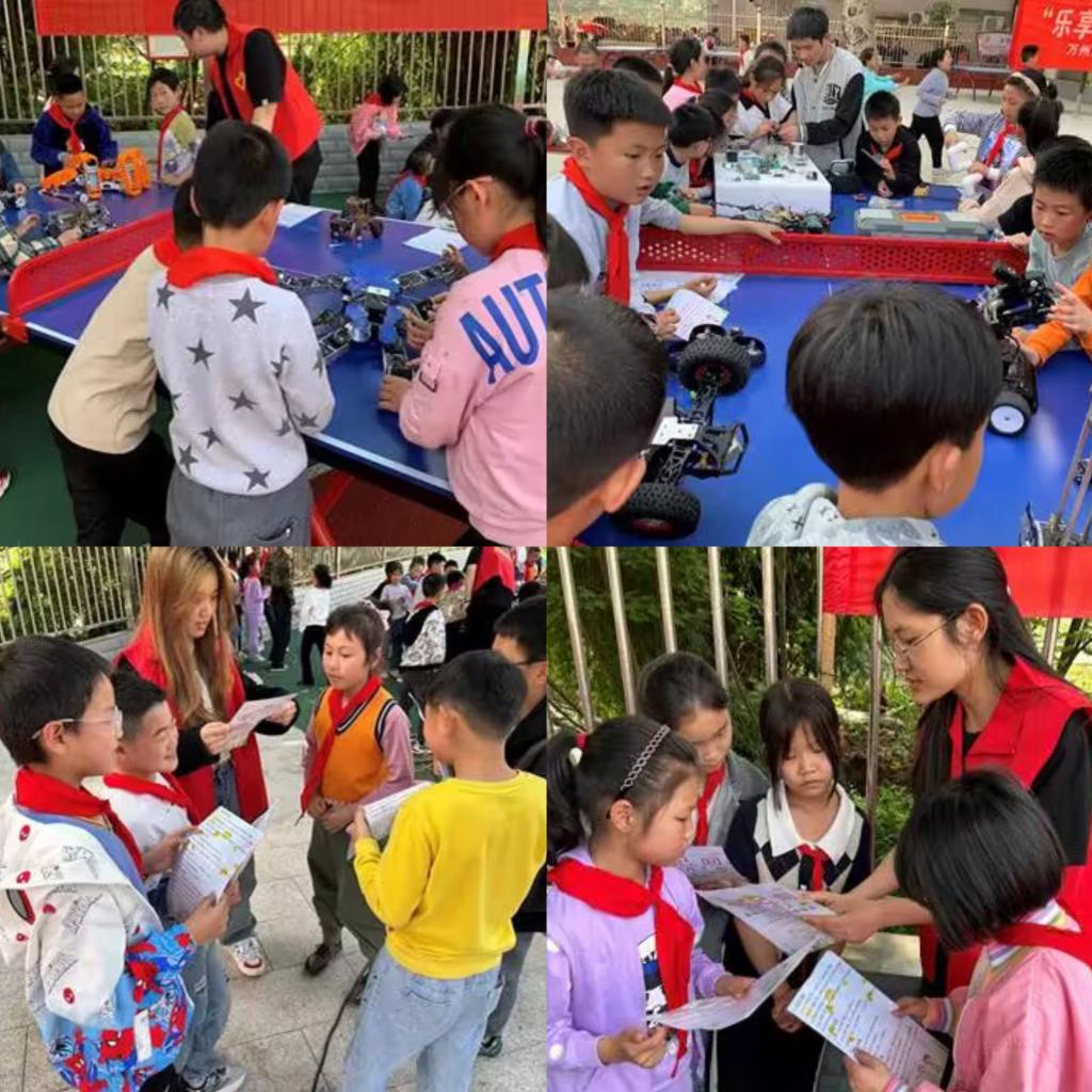 下午2点,志愿者们在慎思楼6栋广场集合后,带着科技创新成果从学院出发前往熊家中心小学。学院志愿服务团队一行30人,带有步兵机器人、哨兵机器人、六足机器人、绘图机器人、3D打印机、飞机模型、循迹小车、无碳小车等科技感十足的展品30余套件,志愿者以展品演示、科普讲解、静态展示、技术体验等丰富多样的形式,让同学们了解科学知识和科技原理。同时,志愿者们从交通安全、溺水防范、饮食安全、消防安全四个方面为同学们讲解安全知识,以提高同学们的安全意识。