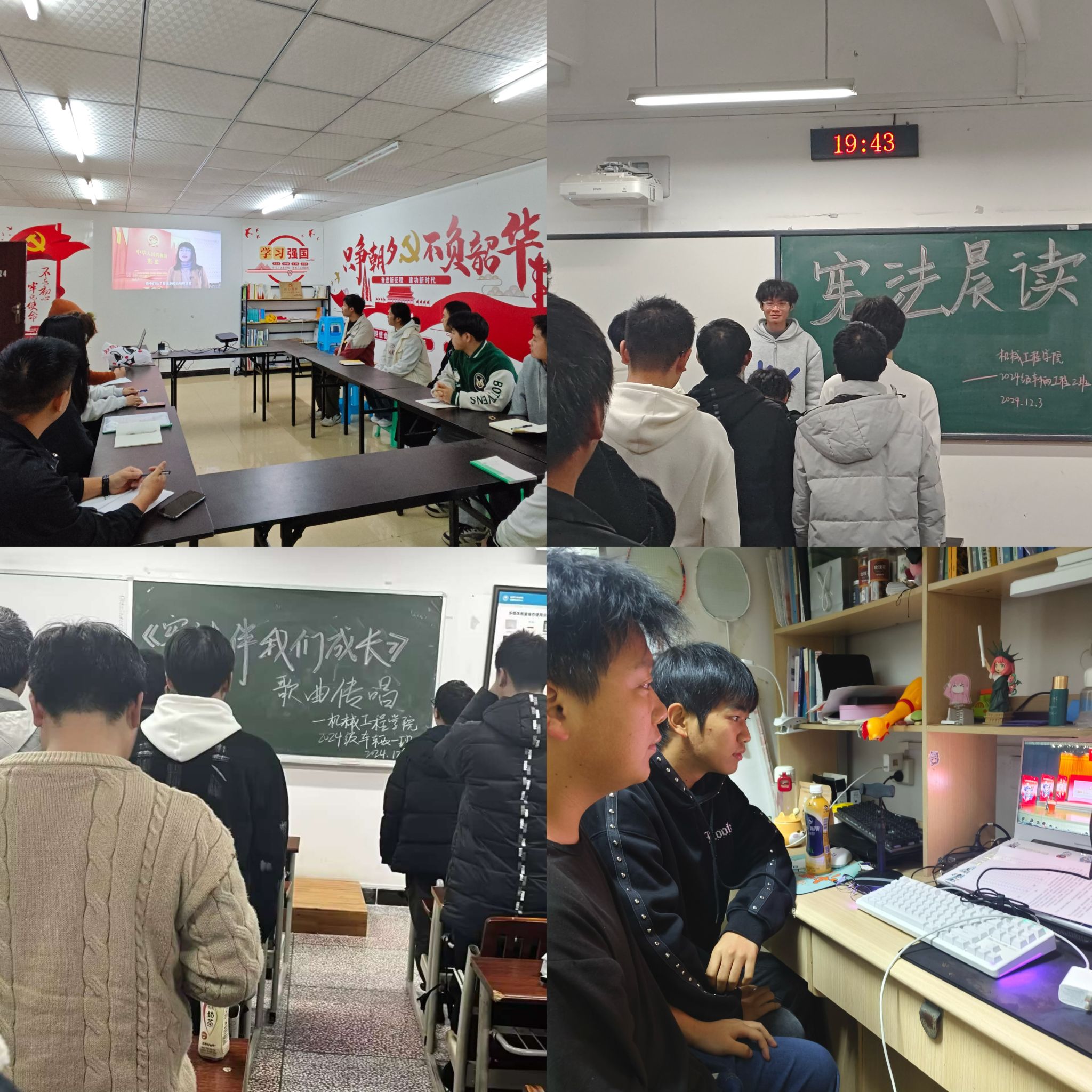 2024年12月4日是第十一个国家宪法日,学院精心组织以不同形式开展宪法学习。在大一年级,学院借助学生早晚自习分别开展宪法晨读与《宪法伴我们成长》歌曲传唱活动,并充分利用学生公寓党员工作站、学生寝室等重要场所,组织无课学生观看教育部全国中小学生“宪法晨读”活动直播,同时学院通过学生活动公众号积极推送“弘扬宪法精神,共筑法治社会”推文,大力弘扬宪法精神;通过不同形式的活动,不断增强了学生法治意识,在学院营造了良好的遵法、守法、学法、用法良好氛围。