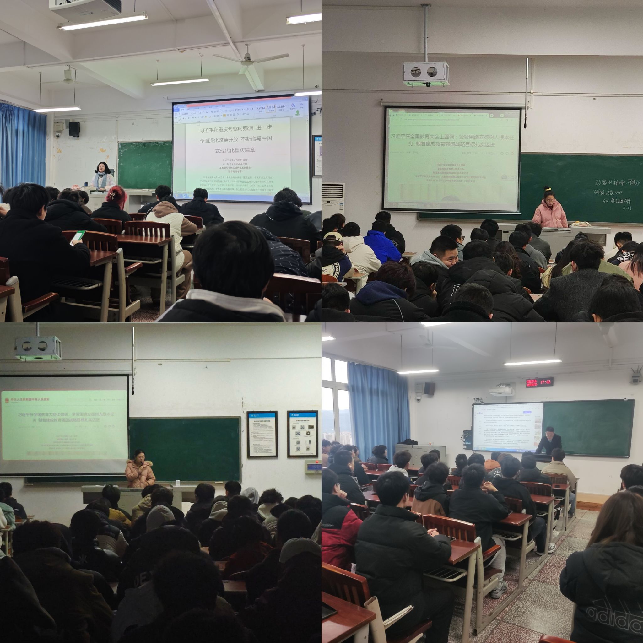 学院辅导员利用周前班会组织各年级学生开展了关于《紧紧围绕立德树人根本任务,朝着建成教育强国战略目标扎实迈》与《进一步全面深化改革开放,不断谱写中国式现代化重庆篇章》的学习。学习中,辅导员详细解读了教育强国战略中立德树人的重要意义,强调同学们要努力成为德智体美劳全面发展的社会主义建设者和接班人,为教育强国贡献力量。同时,结合重庆的独特优势和发展机遇,阐述了全面深化改革开放对谱写中国式现代化重庆篇章的关键作用,鼓励重庆籍同学积极投身家乡建设,外地同学也能在重庆的发展中找到机遇,实现个人价值。