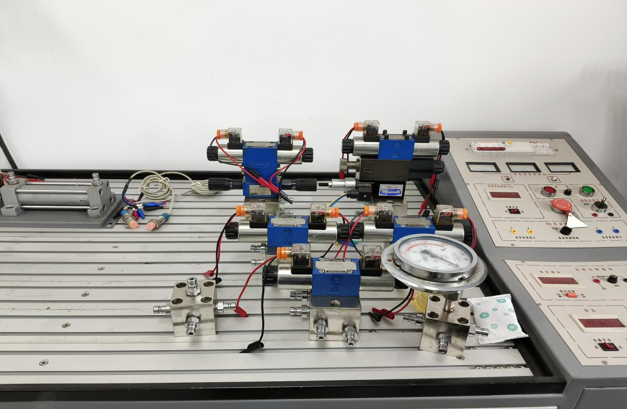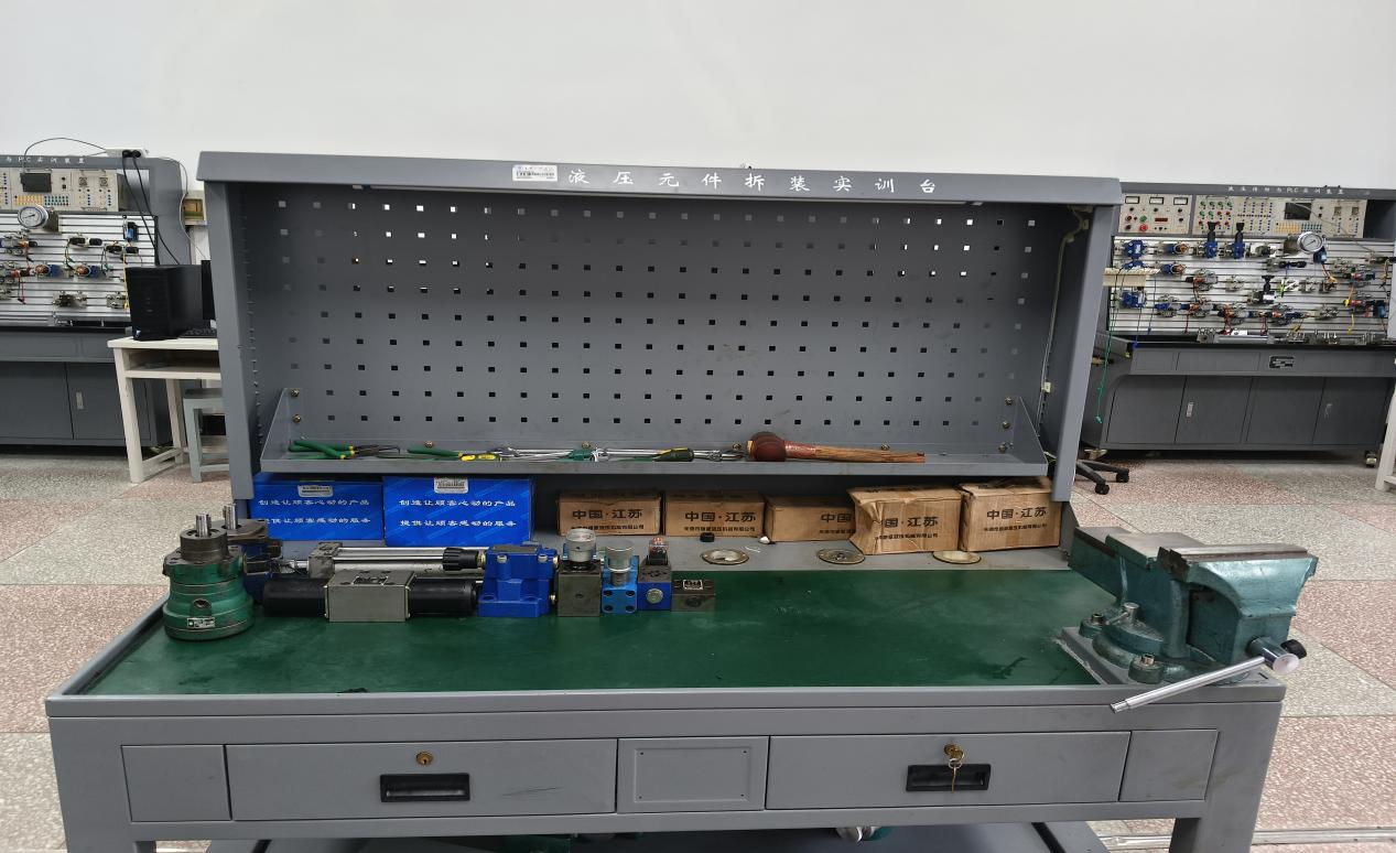 液压系统创新应用实训室主要设备有液压传动系统创新应用实训装置,能够完成液压阀基本调试控制实训、继电器应用控制实训和PLC综合控制实训,通过学生自行设计液压回路和电气控制回路,培养学生独立思考能力、创新能力和动手能力。